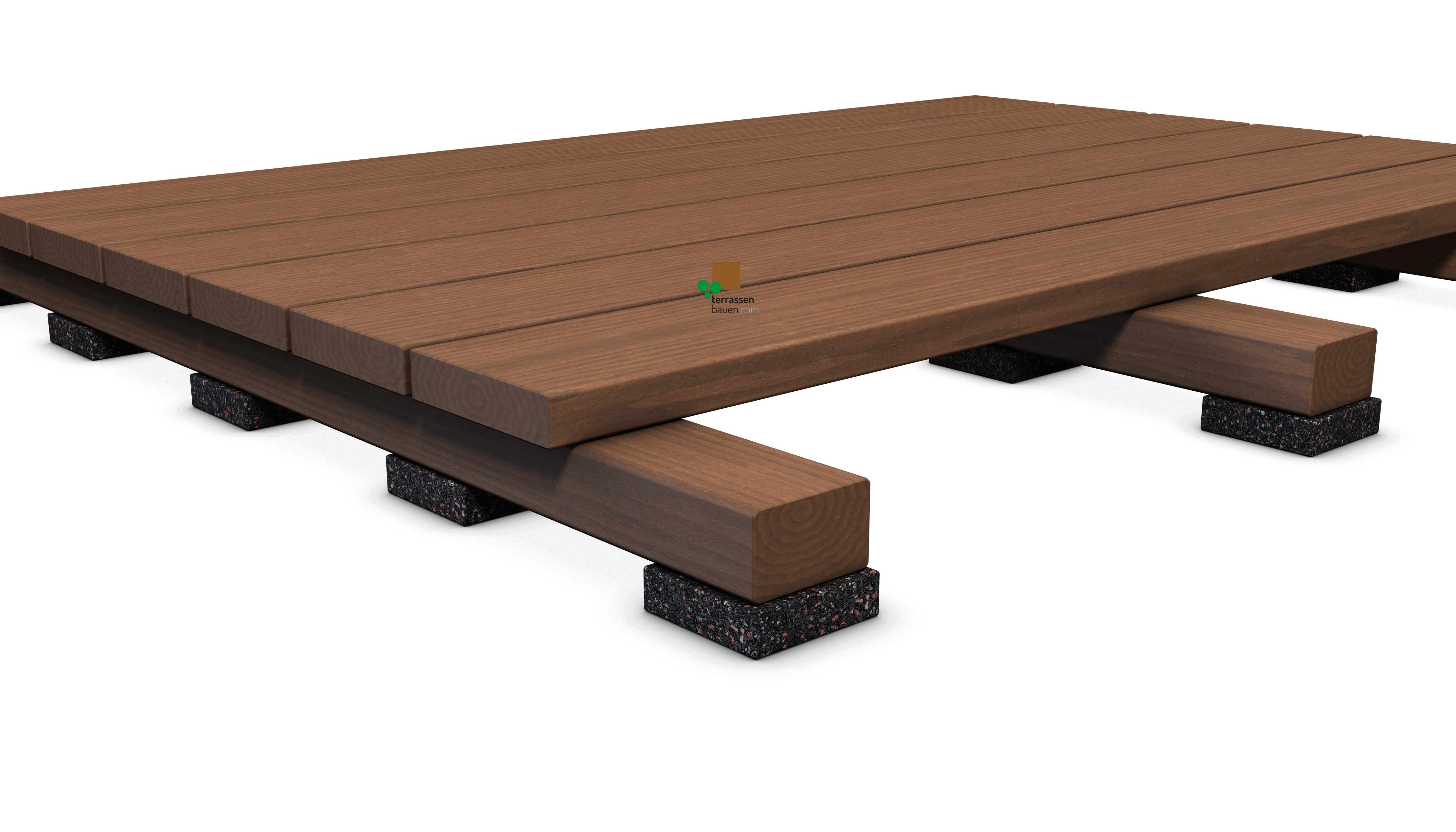 Günstige Unterlege-Pads aus Gummigranulat zur Absicherung des konstruktiven Holzschutzes und zum Niveauausgleich von Terrassen-Unterkonstruktionen.