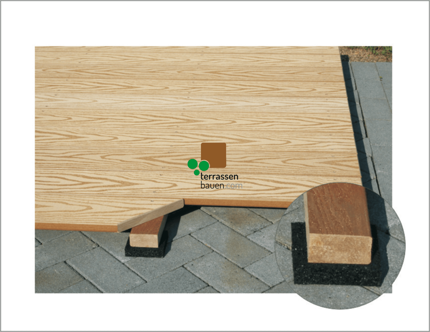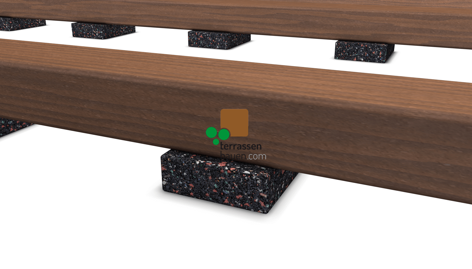 Unterlege-Pads aus Gummigranulat zur Absicherung des konstruktiven Holzschutzes und zum Niveauausgleich von Terrassen-Unterkonstruktionen.